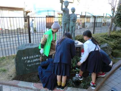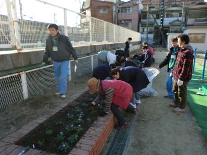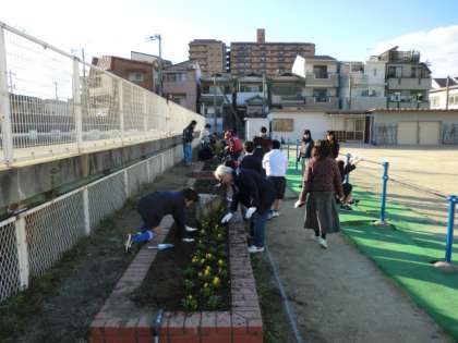 飼育・栽培委員の児童と、グリーンコーディネーター大阪のボランティアの方とで、一緒になって花の苗を植えています。運動場のプール前の花壇と、正門付近の花壇と、南東門付近の花壇に、ビオラなどの花の苗やチューリップなどの球根を植えています。住之江区役所の方も手伝いに来てくれました。