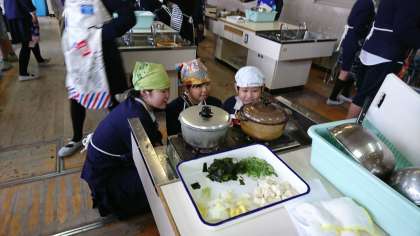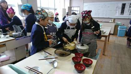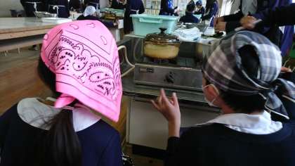 作業の手順を何度も確認して、ご飯が炊きあがっていく様子を観察したり、みそ汁の味見をしながら、これでいいのかと相談したり、どのグループも一生けんめい取組んでいました。