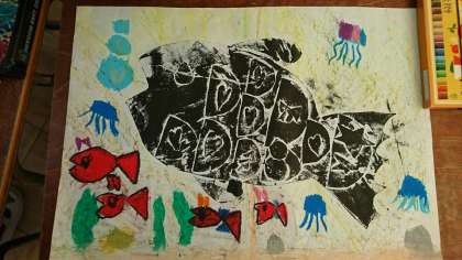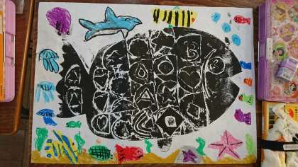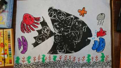 紙はんがの大きなお魚のまわりにいろいろな仲間が加わって、かわいい作品に仕上がっています。