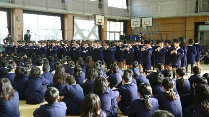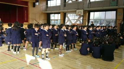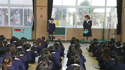 終業式で、1年生と6年生が、2学期の思い出やがんばったことについて発表しました。