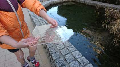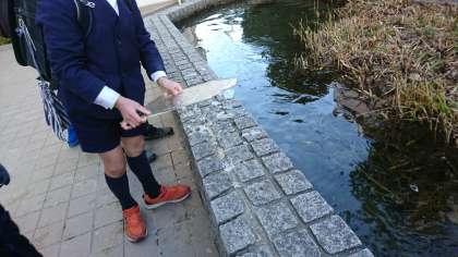 登校してきた子ども達はさっそくめだか池の氷を見つけ、この寒い中、氷をつかんで遊んでいました。