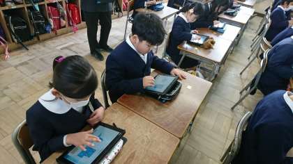 5時間目は、3−3でタブレットを使った学習をしました。1組2組と同じで、算数のタングラムの学習と発表ノートのアプリを使って、写真を撮ったり手書きで文字を書いたりしました。