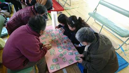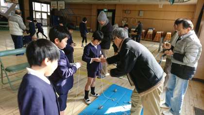 昔遊びでは、羽子板・竹とんぼ・コマ・メンコ・けん玉・カルタ・おはじき・あやとり・折り紙・お手玉・紙飛行機を楽しみました。