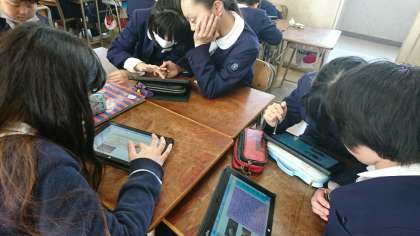 5時間目、5−1では、委員会のお仕事を紹介するノートを、タブレットを使って作っていました。