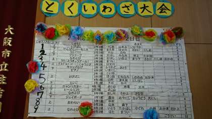 今日披露された得意技は、跳び箱・木琴鉄琴やピアノ演奏・フラフープ・なわとび・歌・グルグルバットからの二重跳び・お笑いなどなど、個性豊かな得意技が、次々と発表されました。