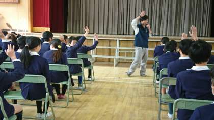 沖先生の声は、まるで楽器のように講堂に響き渡りました。たった45分の間に、6年生の子ども達の声が、大変身!