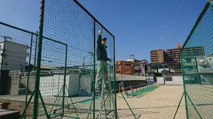今日は、運動場の防球ネットのペンキ塗りをしてくれていました。