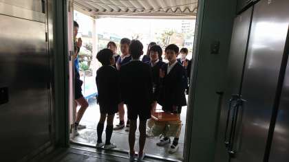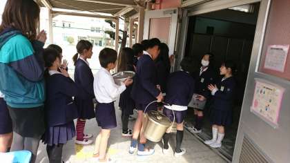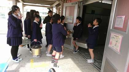 給食室への返却のときに、「ごちそうさま」の声が、給食調理員さんに届くようにとがんばっています。