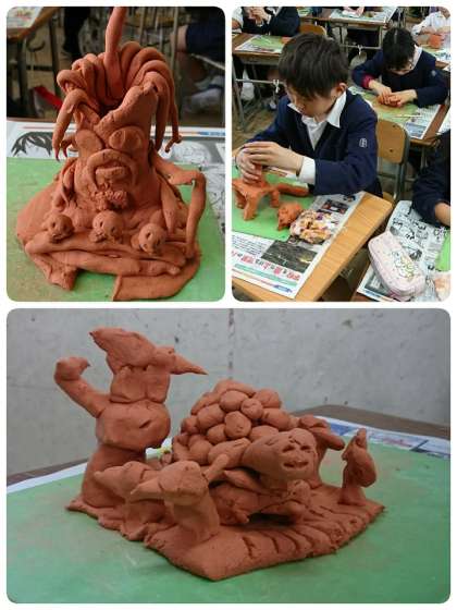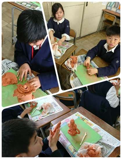 4年生の子ども達が、粘土を使って作品を作っていました。