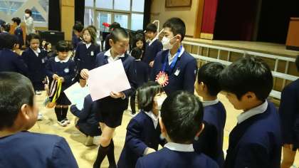 まず、たてわり班の子ども達から6年生にメダルとメッセージカードが贈られました。