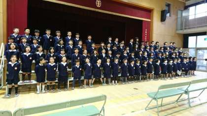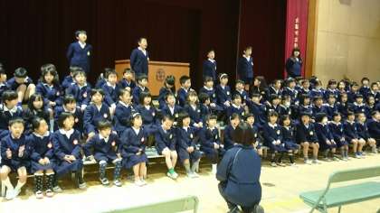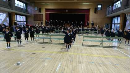 今までは、各教室で入学式の歓迎のことばの練習をしてきて、今日は講堂で入場の仕方や立つ位置の確認をしていました。