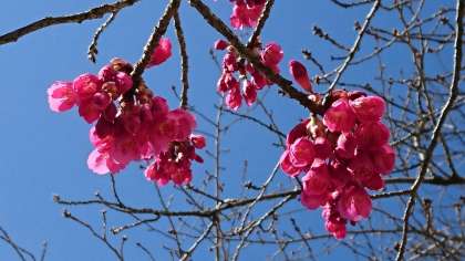 鮮やかな濃いピンク色のお花で、きれいに晴れわたった青空の色と対照的です。