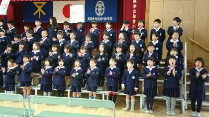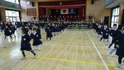 修了式に引き続いて、1年生が今年度最後の入学式のお迎えの練習をしていました。