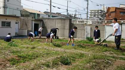 先生達が、4月からの学習に備えて、学習園の草抜きや土を耕していました。
