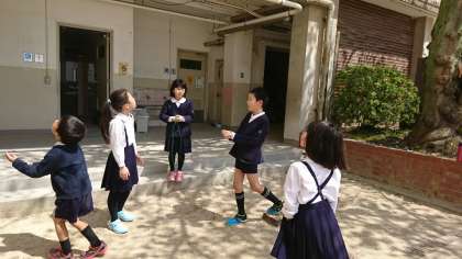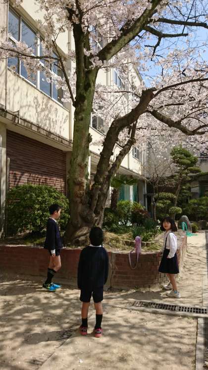桜の木の下で、風が吹くのを待って、花びらを追いかける子ども達でした。(^。^)