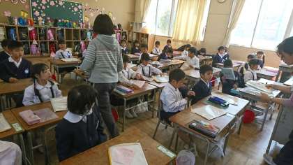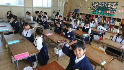 1年生の教室に行くと、先生のお話をしっかり聞いている子どもがたくさんいます。背中はピン、手はひざの上に置いて、先生の方を向いています。