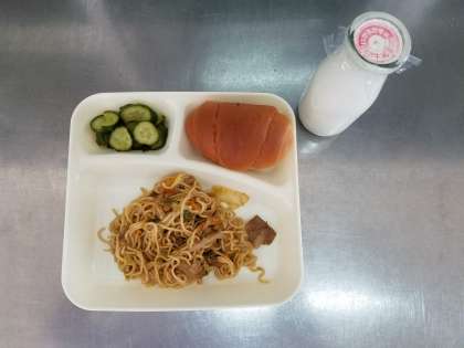 4月13日(金)、今日の給食のメニューは、焼きそば・きゅうりのしょうがづけ・1/2黒糖パン・牛乳でした。