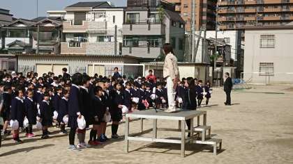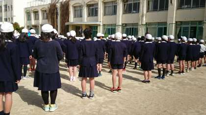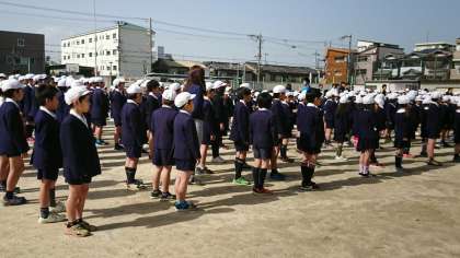 今年度初めての児童朝会を行いました。1年生は、運動場で並ぶのは初めてです。2年生以上の子ども達も並ぶ場所がかわりました。