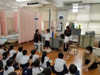 保健室で中西先生からの説明をしっかり聞いていました。慣れない身長・体重計にのり、少し緊張気味の表情でした。これからドンドン大きくなってね。