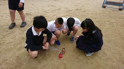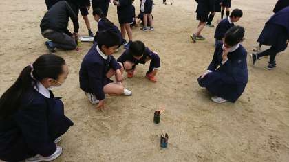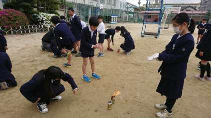 運動場で6年生が、物の燃え方の学習の最初の実験をしていました。