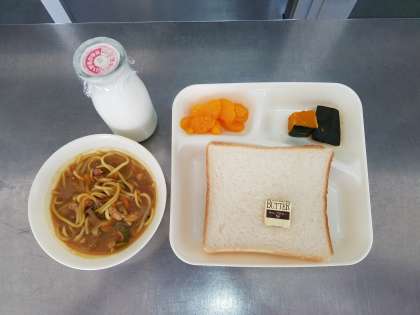 今日の給食のメニューは、カレースープスパゲッティ・焼きかぼちゃ・みかん(缶)・食パン・キューブバター・牛乳でした。