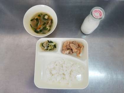 今日の給食のメニューは、鶏肉のからあげ・中華スープ・チンゲンサイともやしの甘酢あえ・ごはん・牛乳でした。