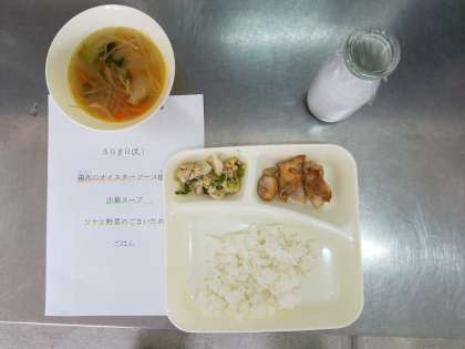今日の給食は、鶏肉のオイスターソース焼き、中華スープ、ツナと野菜のごまいため、ごはん、牛乳でした。オイスターソースで味のついた鶏肉は、柔らかくてとてもおいしかったです。中華スープには、チンゲンサイやにんじん、たまねぎなど野菜がたくさん入っていました。子ども達も喜んで食べていまいた(^^)/