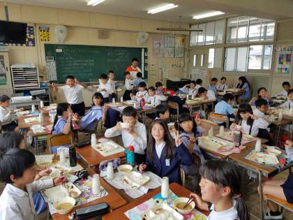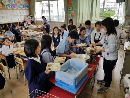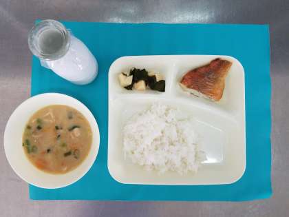 今日の給食は、赤魚のしょうゆだれかけ、みそ汁、わかたけ煮、ごはん、牛乳でした。赤魚は、しょうゆとみりんの甘さがほんのりとついていました。わかたけ煮は、しゃきしゃきとした歯ごたえがあり、とてもおいしかったです。子ども達は、おかわりに行列でした(^.^)