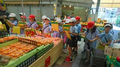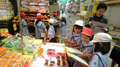 商店街の果物屋さんをたんけんしたグループは、お店の方に今どんなフルーツがよく売れているのか、忙しい時間はいつなのか、何種類ぐらいの果物があるのかなど、たくさん質問をしていました。お店の方も一つ一つていねいに答えてくださいました。フレッシュジュースやカットフルーツも売っていました。果物のあま〜い匂いがいっぱいでした。