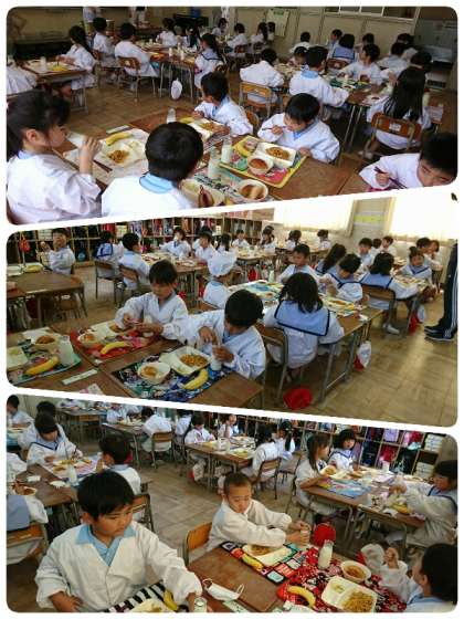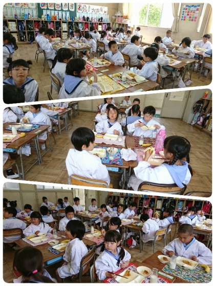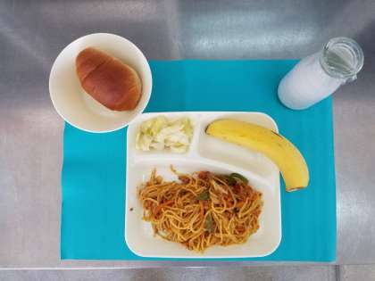 今日の給食は、カレースパゲッティ、キャベツのサラダ、バナナ、1/2黒糖パン、牛乳でした。カレースパゲッティは、にんじん、たまねぎ、ピーマン、トマトが入っていて、カレーの味がしっかりとついていました。キャベツのサラダは、今日の暑さにピッタリなさっぱりとした味付けでした(^◇^)