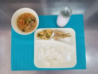 今日の給食は、きびなごの天ぷらとみそ汁、えんどうの卵とじ、ご飯、牛乳でした。