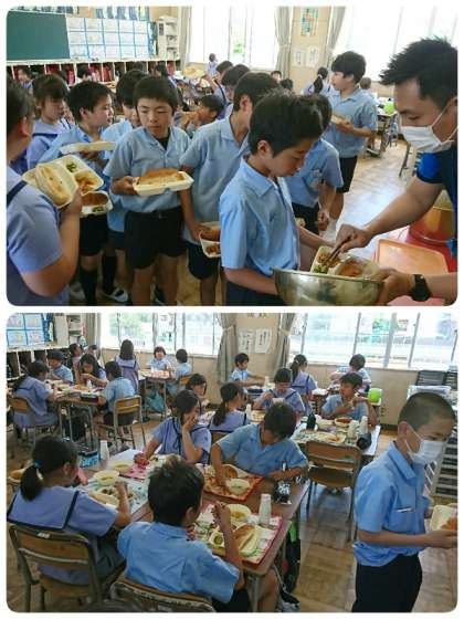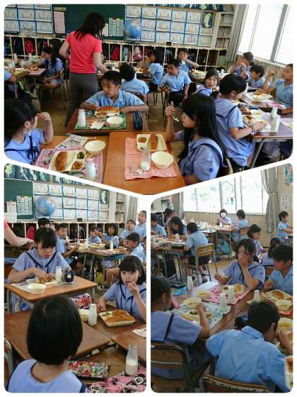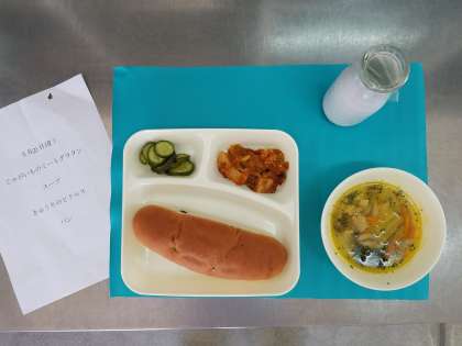 今日の給食は、じゃがいものミートグラタン、スープ、きゅうりのピクルス、レーズンパン、牛乳でした。じゃがいものミートグラタンは、香ばしく焼きあがっていて、ミートソースの味がしっかりとついておいしかったです。「ぺろっと完食週間」初日、レーズンパンと悪戦苦闘しながら完食目指して頑張っていました。