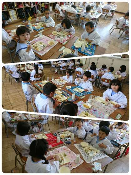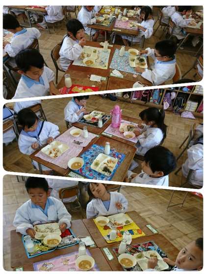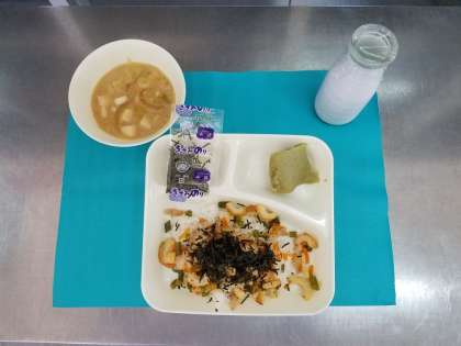 今日の給食は、かやくご飯、みそ汁、まっ茶ういろう、ご飯、牛乳でした。かやくご飯は、鶏肉が柔らかく、三度豆やにんじん、ちくわも入ったボリュームたっぷりのご飯でした。1年生は、まっ茶ういろうを初めて見る子も多く、「これなに〜?」と食べるのに戸惑っている子もいました(^.^)