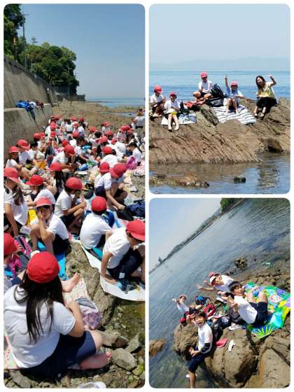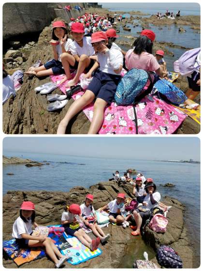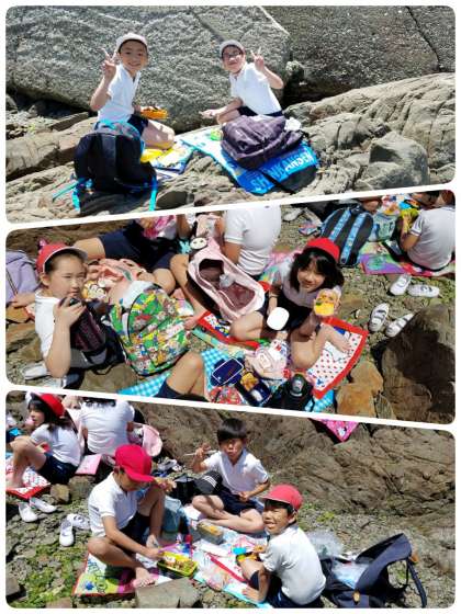 いつもの遠足とは違う、磯辺での食事!