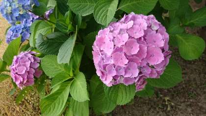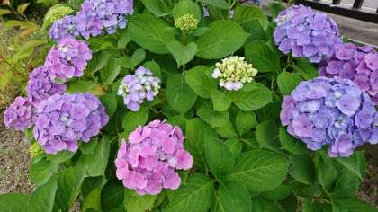 住吉川小学校に咲く紫陽花は、ピンクや青、紫など、一株にいろいろな色が混じって咲いていますよ。