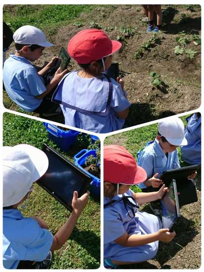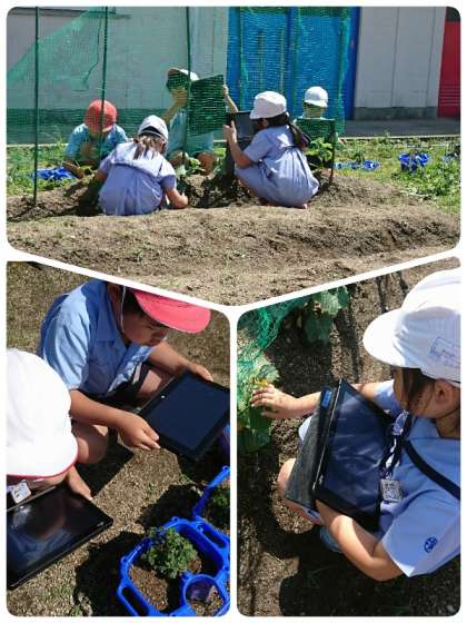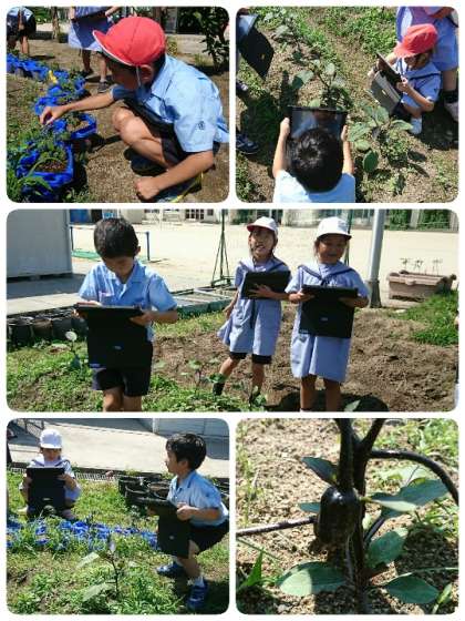 自分達で育てているミニトマト・ナスなどの観察をしていました。タブレットで写真をパチリ!