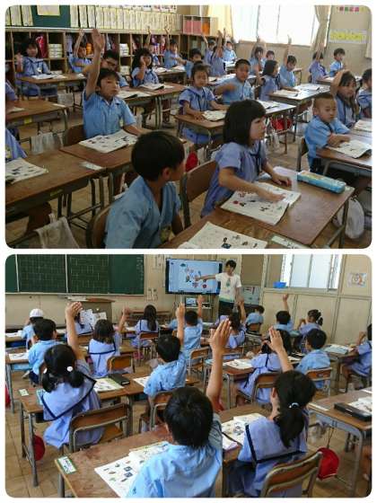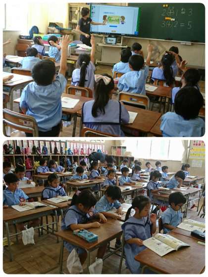 1年生が、算数や国語のデジタル教科書を使って学習していました。デジタル教科書は、教科書が大きな画像で、また、いろいろな具体的操作を見ることができるので、子ども達にとても分かりやすいです。