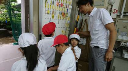 1年生の4人の子ども達が、職員室に講堂の鍵を取りに来ました。
