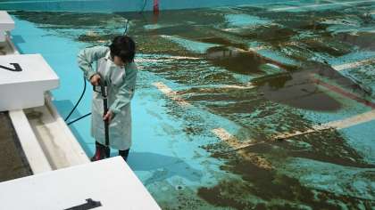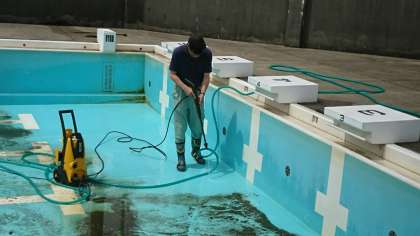 プールの底には泥がたくさんたまっていたり、苔でヌルヌルしていたりと、1回目のお掃除は本当にたいへんです。