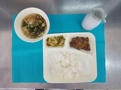 今日の給食は、牛肉のおろしじょうゆかけ、もずくとオクラのとろり汁、野菜のそぼろいため、ご飯、牛乳でした。牛肉のおろしじょうゆかけは、ゆずとしょうゆ、大根おろしがかかっていて、さっぱりとしていました。野菜のそぼろいためは、みそ味で甘く味付けしてあり、とてもおいしかったです(^◇^)