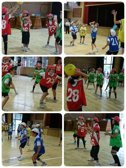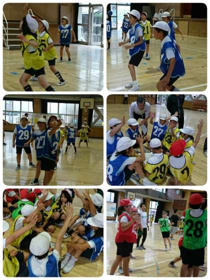 4−3の子ども達は、みんなとっても意欲的で、にこにこと楽しそうに体育に取組んでいました。今日は、チームで話し合って作戦を立ててゲームをしていました。コートを走り回ってパスをつないでたくさん得点を入れてと、子どもの笑顔があふれた授業でした。(*^_^*)