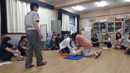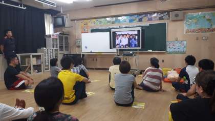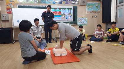 水泳学習を控え、教員とPTAの方が救命救急講習会を受講しました。胸骨圧迫とAEDによる心肺蘇生法を住之江消防署の隊員の方から教えていただきました。