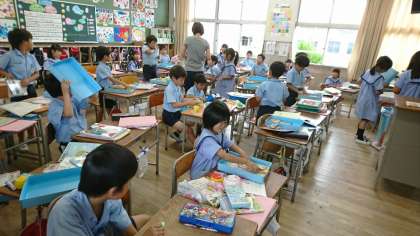 2−3の子ども達が、お道具箱の中、机の中を片付けていました。