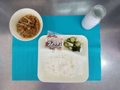 今日の給食は、マーボーはるさめ、ミックス海そうのサラダ、アーモンドフィッシュ、ご飯、牛乳でした。マーボーはるさめは、コリコリとしたたけのこと弾力のあるしいたけの食感が良かったです。ミックス海そうのサラダは、ぬるっとした感じがいいのですが…子ども達は、意見が分かれるところですね(*^^*)