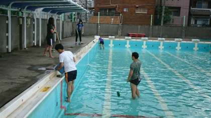 更衣室やプールサイド、シャワーやプールの周りの溝なども、すみずみまで磨きました。