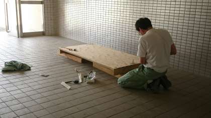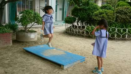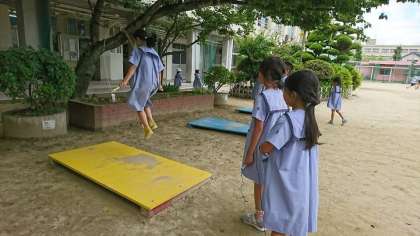 休み時間になると、職員室前のジャンピングボードの弾む音が聞こえてきます。縄跳びが大好きな子どもが多いので、ジャンピングボードの前はいつも行列ができています。その分傷みも早いので、管理作業員さんが定期的に新しいジャンピングボードを作ってくれています。
