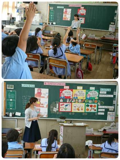 今日は、2年生が、食育の学習で、食べ物の働きについて勉強しました。