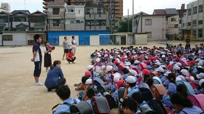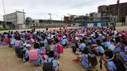 朝から、震度4と大きな地震がありましたが、登校してきた子ども達は、いったん運動場へ避難し、安全点検後の教室に入りました。