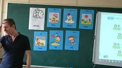 今日の学習内容は、お天気について。子ども達は、C−NETの先生の発音を一生けんめい聞いていました。子どもの耳はすごいです。だんだん慣れていくと思います。