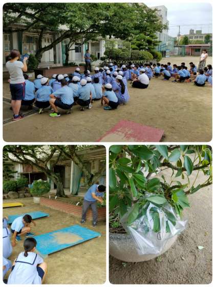 6年生は今、理科で「植物のつくりとはたらき」の学習をしています。1時間目の授業の前に職員室前に集まって実験の説明を聞いていました。